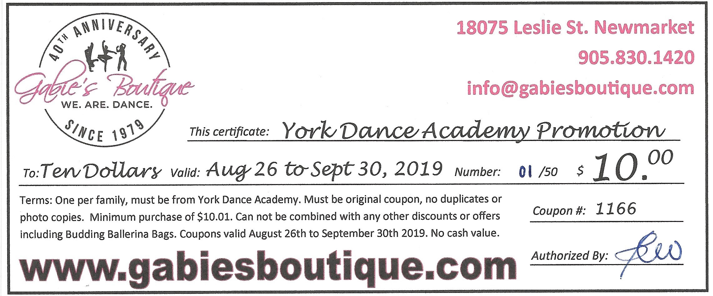 We have a special gift from our friends at Gabie’s Boutique! The first 50 dancers to register for one of our dance classes and mention code “Gabies” when you register will receive a $10 gift certificate to put towards their dance supplies.